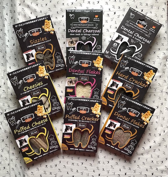 (写真はすぐ小型犬用のが売り切れちゃったので、いまは9種類だけ並べています)