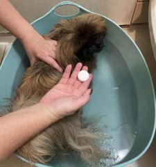 動物の大きさにより、以下の割合でシャンプーをぬるま湯でよく泡立て、全身に付けて、毛の向きと反対にマッサージしながら洗っていきます。